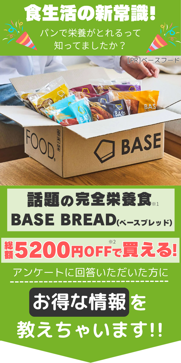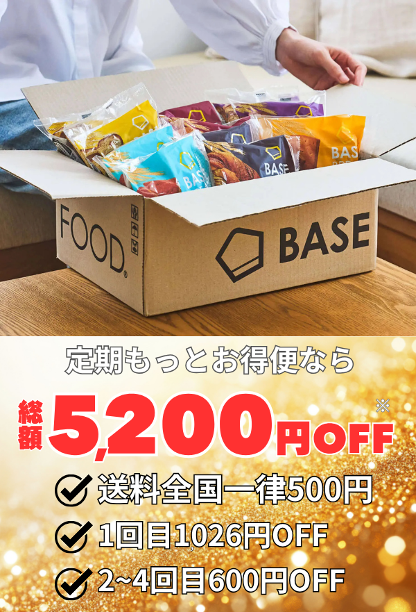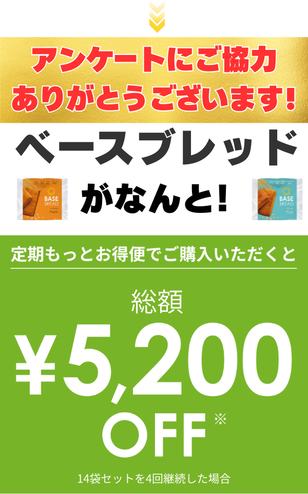 ※2:本ページから購入し、定期もっとお得便(3ヶ月更新)でBASE BREAD14袋セットを4回継続した場合